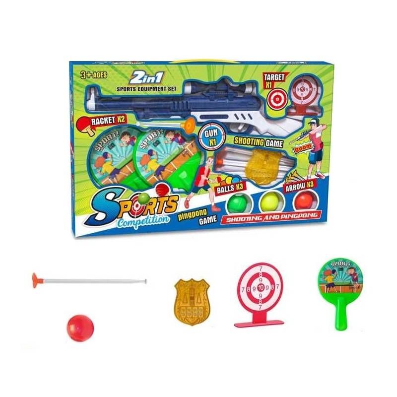 Παιχνίδι παιχνίδι 2 σε 1 με στόχο και όπλο με βέλη-βεντούζες ενώ διαθέτει και σετ με mini ρακέτες με 3 μπαλάκια Ping Pong.