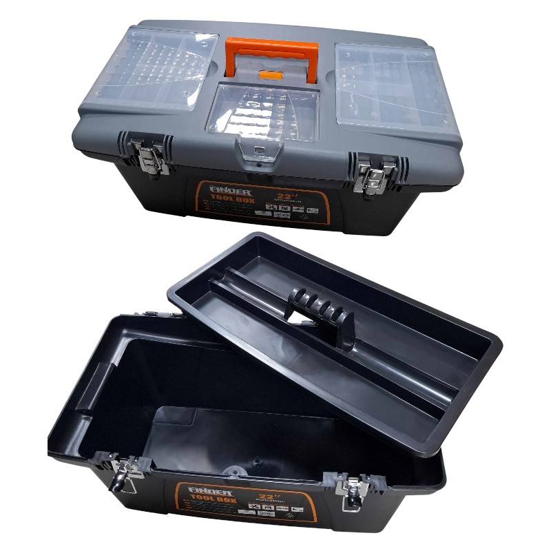 Πλαστική εργαλειοθήκη Finder μεγέθους 22'' με πολλαπλές θήκες αποθήκευσης και διαχωριστικά. Διαθέτει μεταλλικά κλιπς για κλείσιμο ασφαλείας και χειρολαβή.