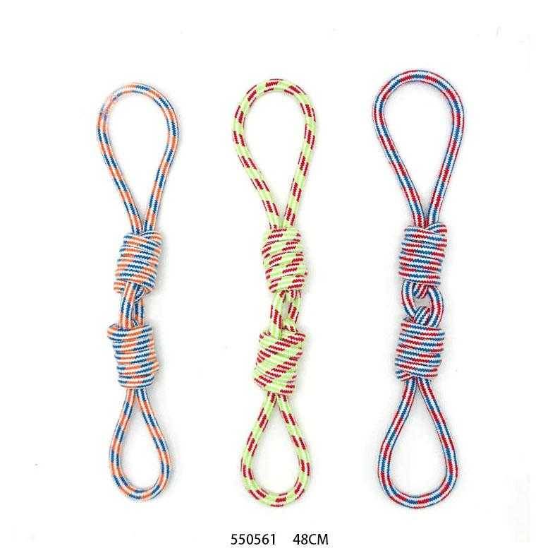 Παιχνίδι σκύλου σχοινί με κόμπους, από ανθεκτικό, μη τοξικό πολυεστέρα, ιδανικό για παιχνίδια τραβήγματος/αντίστασης ενώ παράλληλα βοηθά στην υγιεινή στόματος του σκύλου σας καθώς καθαρίζει ήπια και απασχολεί τα δόντια του. Συνολικό μήκος: 48cm.