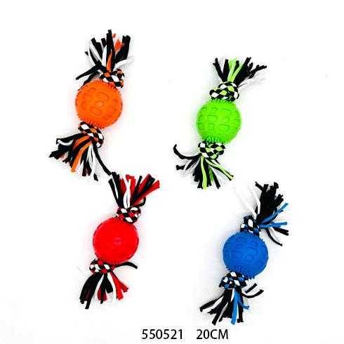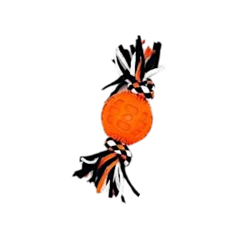 Παιχνίδι σκύλου σχοινί με μασητική μπάλα, από ελαστικό, ανθεκτικό, μη τοξικό πολυεστέρα, ιδανικό για παιχνίδια τραβήγματος/αντίστασης ενώ παράλληλα βοηθά στην υγιεινή στόματος του σκύλου σας καθώς καθαρίζει ήπια και απασχολεί τα δόντια του. Συνολικό μήκος: 20cm.