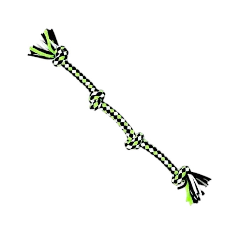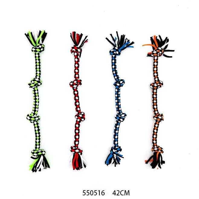 Παιχνίδι σκύλου σχοινί με κόμπους, από ελαστικό, ανθεκτικό, μη τοξικό πολυεστέρα, ιδανικό για παιχνίδια τραβήγματος/αντίστασης ενώ παράλληλα βοηθά στην υγιεινή στόματος του σκύλου σας καθώς καθαρίζει ήπια και απασχολεί τα δόντια του. Συνολικό μήκος: 42cm.
