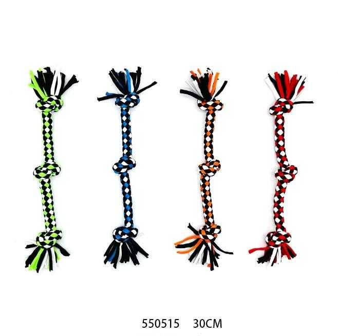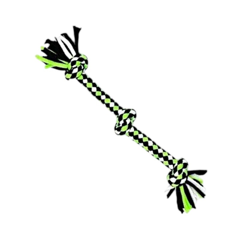 Παιχνίδι σκύλου σχοινί με κόμπους, από ελαστικό, ανθεκτικό, μη τοξικό πολυεστέρα, ιδανικό για παιχνίδια τραβήγματος/αντίστασης ενώ παράλληλα βοηθά στην υγιεινή στόματος του σκύλου σας καθώς καθαρίζει ήπια και απασχολεί τα δόντια του. Συνολικό μήκος: 30cm.
