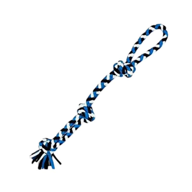 Παιχνίδι σκύλου σχοινί με κόμπους, από ανθεκτικό, μη τοξικό πολυεστέρα, ιδανικό για παιχνίδια τραβήγματος/αντίστασης ενώ παράλληλα βοηθά στην υγιεινή στόματος του σκύλου σας καθώς καθαρίζει ήπια και απασχολεί τα δόντια του. Συνολικό μήκος: 43cm.