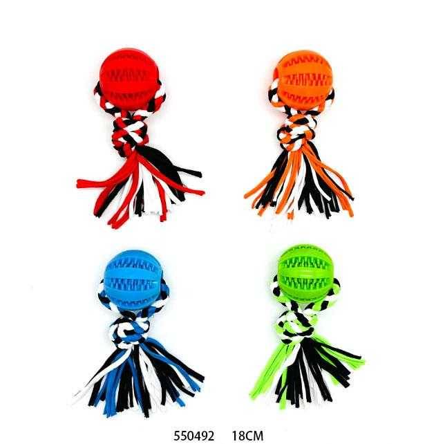 Παιχνίδι σκύλου πλεκτό σχοινί με μπάλα μασητική, κατασκευασμένο από ιδιαίτερα ανθεκτικά, μη τοξικά υλικά, ιδανικό για πολλαπλά είδη παιχνιδιού και άσκησης, ενώ παράλληλα βοηθά στην υγιεινή στόματος του σκύλου σας καθώς καθαρίζει ήπια και απασχολεί τα δόντια του. Συνολικό μήκος: 18cm.