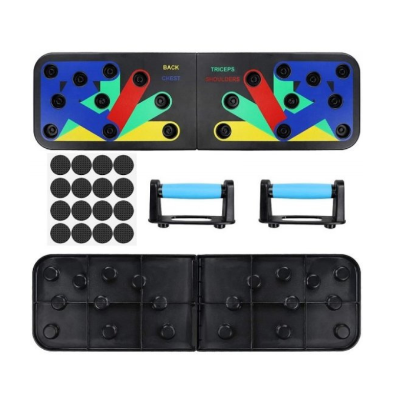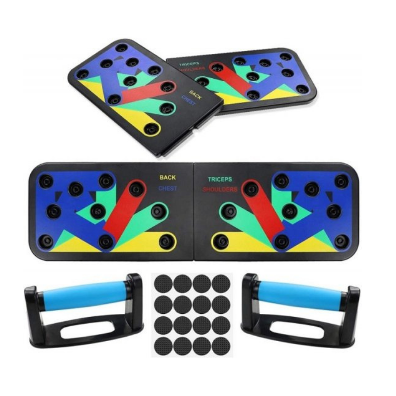 Η σανίδα για push up διαθέτει 2 λαβές γυμναστικής push ups και 10 διαφορετικές θέσεις στις οποίες κουμπώνουν για να γυμνάσουν ξεχωριστή μυική ομάδα. Προσφέρουν την ιδανική στήριξη ώστε να επιτύχετε μεγαλύτερη βύθιση και σας βοηθούν για την σωστή εκγύμναση και ολοκλήρωση των ασκήσεων πιέσεων στήθους, ώμων, τρικέφαλων, ενώ συμβάλουν στην αποφυγή πιθανού τραυματισμού τους από κακή στάση του σώματος κατά την άσκηση. Διαθέτουν αντιολισθητική λαβή και προστατευτικά πατάκια πατώματος.
