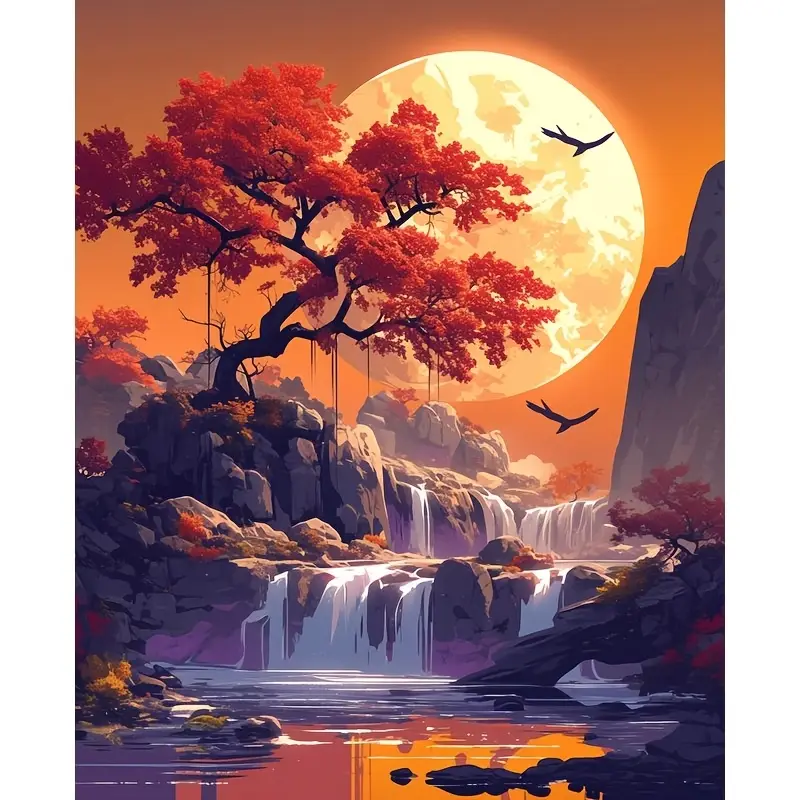 Olympus Diamond Painting "Sakura,waterfalls and big moon" - Ψηφιδωτό Μωσαικό "Κερασιά,καταρράκτες και μεγάλο φεγγάρι" 50Χ40
