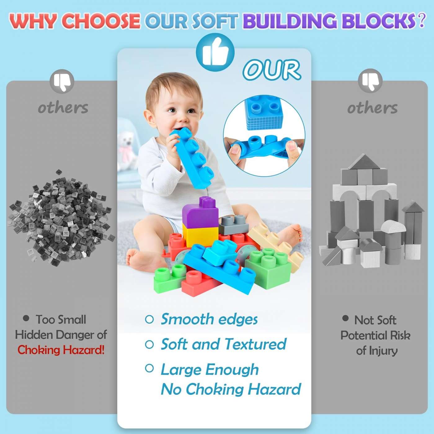 Πολύχρωμα μαλακά τουβλάκια για μωρά απο 12 μηνών και άνω κατασκευασμένα από μη τοξικά υλικά ειδικά σχεδιασμένα για μωρά.Είναι μαλακά και δεν υπαρχουν μικρά κομμάτια ώστε να αποφεύγεται ο κίνδυνος πνιγμού.
